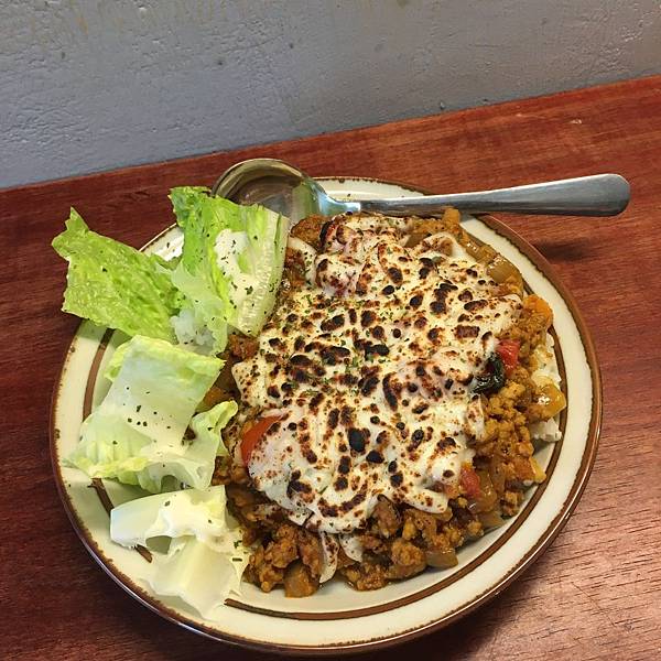 拌炒過後的香料配上咖哩白飯,上頭是炙燒起司,再撒上微辣的匈牙利紅椒粉🌶️